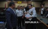 Terdakwa Thomas Trikasih Lembong atau Tom Lembong memeluk istrinya usai menjalani sidang pembacaan putusan di Pengadilan Negeri Tipikor, Jakarta, Senin (30/6/2025). Majelis Hakim menjatuhkan hukuman kepada mantan Menteri Perdagangan Tom Lembong dengan pidana 4 tahun dan enam bulan penjara, denda Rp750 juta subsider 6 bulan kurungan dalam kasus dugaan korupsi impor gula. (FOTO : Republika/Thoudy Badai)