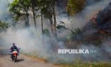 Warga melintas saat terjadinya kebakaran lahan di Nagari Sulik Aia, Solok, Sumatera Barat, Sabtu (19/7/2025). Data BPBD Kabupaten Solok, kebakaran hutan dan lahan (karhutla) terjadi di sejumlah titik di daerah itu menyebabkan sedikitnya 300 hektare area perkebunan dan hutan terbakar serta sebagian sudah mendekati permukiman. (FOTO : ANTARA FOTO/Iggoy el Fitra)