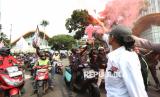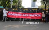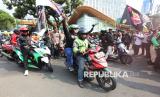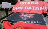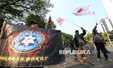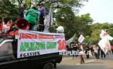 Sejumlah pengemudi ojek online (Ojol) melakukan aksi demontrasi di kawasan Patung Kuda, Monas, Jakarta, Senin (21/7/2025). Dalam aksinya mereka menuntut agar pemerintah membatasi komisi aplikator maksimal 10 persen serta mendesak pemerintah untuk menerbitkan UU Transportasi Online Indonesia. (FOTO : Republika/Prayogi)