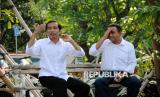 Calon presiden pasangan nomor urut dua Joko Widodo dan Juru Bicara Tim Pemenangan Pasangan Jokowi-JK, Anies Baswedan duduk di bangku taman ketika berkunjung ke Taman Waduk Pluit di Jakarta Utara, Selasa (22/7/2014). Joko Widodo menyempatkan diri meninjau perkembangan proses revitalisasi Waduk Pluit di sela-sela menunggu selesainya proses rekapitulasi suara nasional Pemilu Presiden Tahun 2014 yang berlangsung di Gedung KPU, Jakarta. (FOTO : Yasin Habibi/Republika)