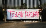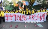 Mahasiswa bersama koalisi masyarakat sipil menggelar aksi tolak revisi Rancangan Kitab Undang-Undang Hukum Acara Pidana (RKUHAP) di Gerbang Pancasila, Kompleks Parlemen, Senayan, Jakarta, Selasa (22/7/2025). Aksi ini dilakukan sebagai bentuk penolakan terhadap RKUHAP yang dinilai berpotensi merugikan rakyat. RKUHAP kerap menuai kritik karena dinilai bermasalah, baik dari sisi substansi maupun proses pembahasannya. Selain itu mereka menyerukan penundaan pengesahan RKUHAP dan pembukaan ruang dialog partisipatif yang melibatkan publik secara luas dan transparan. (FOTO : Republika/Prayogi)