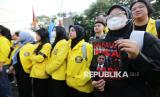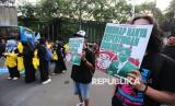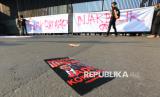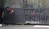Seorang peserta aksi mencoret pagar saat aksi tolak revisi Rancangan Kitab Undang-Undang Hukum Acara Pidana (RKUHAP) di Gerbang Pancasila, Kompleks Parlemen, Senayan, Jakarta, Selasa (22/7/2025). Aksi ini dilakukan sebagai bentuk penolakan terhadap RKUHAP yang dinilai berpotensi merugikan rakyat. RKUHAP kerap menuai kritik karena dinilai bermasalah, baik dari sisi substansi maupun proses pembahasannya. Selain itu mereka menyerukan penundaan pengesahan RKUHAP dan pembukaan ruang dialog partisipatif yang melibatkan publik secara luas dan transparan. (FOTO : Republika/Prayogi)