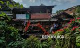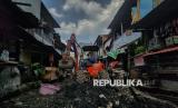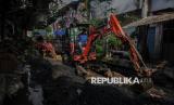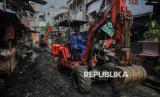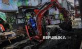 Petugas mengoperasikan alat berat untuk mengeruk lumpur di aliran Kali Krukut, Kebon Melati, Jakarta, Selasa (22/7/2025). Suku Dinas Sumber Daya Air (SDA) Jakarta Pusat melakukan pengerukan sedimentasi anak Kali Krukut sepanjang 1 kilometer dengan kedalaman 2-3 meter sebagai upaya mengatasi banjir di wilayah tersebut. (FOTO : Republika/Thoudy Badai)