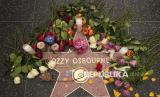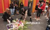 Penggemar meletakkan karangan bunga di Ozzy Osbourne Hollywood Walk of Fame di Los Angeles, Selasa (22/7/2025) waktu setempat. Meninggalnya Ozzy Osbourne meninggalkan duka bagi penggemar setianya. Ozzy meninggal di usia 76 tahun karena komplikasi penyakit yang dialaminya. (FOTO : AP Photo/Damian Dovarganes)