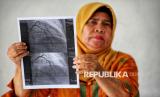 Ibu Heti Herawati (64) menunjukan salah satu hasil pemeriksaan jantungnya. Terakhir, pada April 2025, ibu menjalani prosedur pemasangan ring jantung yang ketiga. (FOTO : Prayogi/Republika)