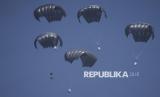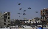 Bantuan kemanusiaan dikirimkan melalui udara kepada warga Palestina di Kota Gaza, Ahad (27/7/2025). Militer Israel memulai jeda aktivitas militer taktis lokal di tiga wilayah berpenduduk padat di Gaza selama 10 jam sehari. Selama jeda aktivitas militer, bantuan kemanusiaan diizinkan masuk di Kota Gaza, Deir al-Balah dan Muwasi. (FOTO : AP Photo/Abdel Kareem Hana)