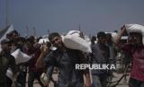 Warga Palestina menggotong bantuan makanan yang diturunkan dari konvoi bantuan kemanusiaan di Kota Gaza, Ahad (27/7/2025). Selama jeda aktivitas militer Israel, bantuan kemanusiaan diizinkan masuk di Kota Gaza, Deir al-Balah dan Muwasi. Seruan dunia menguat agar Israel membuka blokade bantuan kemanusiaan ditengah bencana kelaparan akut di Gaza. (FOTO : AP Photo/Jehad Alshrafi)