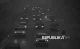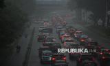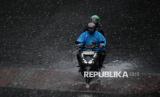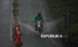 Pengendara melintas di Jalan Sudirman saat hujan di Jakarta, Senin (28/7/2025). Sejumlah wilayah di Jakarta Pusat, Jakarta Selatan dan Timur diguyur hujan pada siang hari pukul 13.30 WIB. Suasana lalu lintas di kawasan Sudirman sempat mengalami kemacetan akibat intensitas hujan tinggi. Sementara BMKG mengimbau masyarakat untuk waspada terhadap potensi perubahan cuaca serta disarankan membawa perlengkapan seperti payung dan jas hujan. (FOTO : Republika/Thoudy Badai)