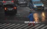 Pedagang jas hujan berkeliling mencari pembeli di Jalan Sudirman saat hujan di Jakarta, Senin (28/7/2025). Sejumlah wilayah di Jakarta Pusat, Jakarta Selatan dan Timur diguyur hujan pada siang hari pukul 13.30 WIB. Suasana lalu lintas di kawasan Sudirman sempat mengalami kemacetan akibat intensitas hujan tinggi. Sementara BMKG mengimbau masyarakat untuk waspada terhadap potensi perubahan cuaca serta disarankan membawa perlengkapan seperti payung dan jas hujan. (FOTO : Republika/Thoudy Badai)
