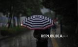 Warga berjalan mengenakan payung saat hujan di Jalan Sudirman di Jakarta, Senin (28/7/2025). Sejumlah wilayah di Jakarta Pusat, Jakarta Selatan dan Timur diguyur hujan pada siang hari pukul 13.30 WIB. Suasana lalu lintas di kawasan Sudirman sempat mengalami kemacetan akibat intensitas hujan tinggi. Sementara BMKG mengimbau masyarakat untuk waspada terhadap potensi perubahan cuaca serta disarankan membawa perlengkapan seperti payung dan jas hujan. (FOTO : Republika/Thoudy Badai)