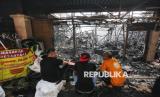 Pedagang mencari sisa-sisa barang di kiosnya yang hangus terbakar di Pasar Taman Puring, Jakarta, Selasa (29/7/2025). (FOTO : Republika/Prayogi)