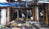 Pedagang mengamati kiosnya yang hangus terbakar di Pasar Taman Puring, Jakarta, Selasa (29/7/2025). (FOTO : Republika/Prayogi)