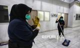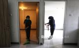 Pekerja membersihkan bagian dalam bangunan Hunian Pekerja Pendukung Operasional (HPPO) Jakarta Internasional Stadium (JIS) atau Kampung Susun Bayam. Pemprov DKI Jakarta terus mendorong percepatan pemanfaatan Kampung Susun bayam sebagai hunian layak dan terjangkau bagi warga, sekaligus menjaga prinsip keadilan sosial dalam setiap proses relokasi dan penyediaan hunian. (FOTO : Prayogi/Republika)