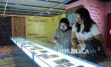 Pengunjung mengamati diorama sejarah batik di area Gelar Batik Nusantara 2025 di Pasaraya Blok M, Jakarta Selatan, Kamis (31/7/2025). Acara tersebut menyajikan beragam koleksi batik autentik, diorama sejarah batik nusantara, bazar kain dan produk batik lainnya hingga pelatihan pembuatan batik tulis bagi pengunjung. Gelar Batik Nusantara ini berlangsung hingga 3 Agustus 2025 mendatang yang diharapkan mampu menjadi ruang interaksi mengenai tradisi batik, ruang kreasi hingga ruang kolaborasi lintas generasi sehingga dapat melestarikan batik nusantara. (FOTO : Republika/Thoudy Badai)