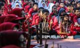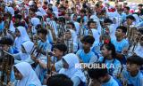 REPUBLIKA.CO.ID, SEMARANG -- Peserta memainkan angklung bersama dalam pertunjukan Senandung Seribu Angklung di SMP Negeri 5, Semarang, Jawa Tengah, Jumat (1/8/2025).