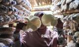 REPUBLIKA.CO.ID, KALTIM -- Petani menunjukkan jamur tiram saat memanen di Desa Bhuana Jaya, Tenggarong Seberang, Kutai Kartanegara, Kalimantan Timur, Rabu (30/7/2025).