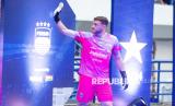 Penjaga gawang Persib Bandung Adam Przybek menyapa suporter saat memasuki lapangan menggunakan jersey baru pada Peluncuran Jersey Tim Persib Bandung Pesta Biru di Stadion Gelora Bandung Lautan Api (GBLA), Bandung, Jawa Barat, Sabtu (2/8/2025). Persib Bandung meluncurkan tiga jersey untuk kandang, tandang dan alternatif berwarna biru, putih biru dan kuning serta tiga warna jersey untuk penjaga gawang dalam menjalani musim kompetisi Super League Indonesia 2025/2026. (FOTO : ANTARA FOTO/Novrian Arbi)