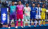 Tiga penjaga gawang Persib Bandung Fitrah Maulana (kiri), Adam Przybek (kedua kiri) dan Teja Paku Alam (ketiga kiri) bersama pesepak bola Persib Bandung Marc Klok (ketiga kanan), Rezaldi Hehanussa (kedua kanan) dan Zalnando (kanan) menggunakan jersey baru saat Peluncuran Jersey Tim Persib Bandung Pesta Biru di Stadion Gelora Bandung Lautan Api (GBLA), Bandung, Jawa Barat, Sabtu (2/8/2025). Persib Bandung meluncurkan tiga jersey untuk kandang, tandang dan alternatif berwarna biru, putih biru dan kuning serta tiga warna jersey untuk penjaga gawang dalam menjalani musim kompetisi Super League Indonesia 2025/2026. (FOTO : ANTARA FOTO/Novrian Arbi)