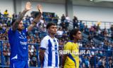 Pesepak bola Persib Bandung Marc Klok (kiri), Rezaldi Hehanussa (tengah) dan Zalnando (kanan) berdiri menyapa suporter saat Peluncuran Jersey Tim Persib Bandung Pesta Biru di Stadion Gelora Bandung Lautan Api (GBLA), Bandung, Jawa Barat, Sabtu (2/8/2025). Persib Bandung meluncurkan tiga jersey untuk kandang, tandang dan alternatif berwarna biru, putih biru dan kuning serta tiga warna jersey untuk penjaga gawang dalam menjalani musim kompetisi Super League Indonesia 2025/2026. (FOTO : ANTARA FOTO/Novrian Arbi)