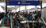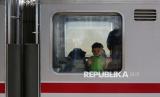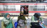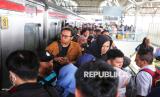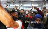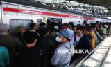 Penumpang berada di dalam KRL di Stasiun Manggarai, Jakarta, Selasa (5/8/2025). Stasiun Manggarai sempat mengalami penumpukan penumpang akibat anjloknya rangkaian KRL Commuter Line di jalur 9 Stasiun Jakarta Kota pada Selasa pagi. Insiden tersebut mengakibatkan gangguan operasional perjalanan KRL lintas Bogor–Jakarta Kota. (FOTO : Republika/Prayogi)