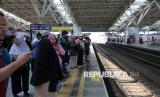 Penumpang menunggu KRL di Stasiun Manggarai, Jakarta, Selasa (5/8/2025). Berdasarkan pantauan pada pukul 10.00 WIB penumpukan penumpang di stasiun Manggarai sudah mulai terurai. (FOTO : Republika/Prayogi)