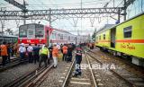 Sejumlah petugas mengevakuasi rangkaian KRL Commuter Line nomor 1189 relasi Bogor-Jakarta Kota yang anjlok di emplasemen Stasiun Jakarta Kota, Jakarta, Selasa (5/8/2025). Akibat kejadian tersebut, PT KAI Commuter Line melakukan rekayasa pola operasi yaitu perjalanan KRL Commuter Line tujuan Stasiun Jakarta Kota dari Stasiun Bogor perjalanannya hanya sampai Stasiun Manggarai. (FOTO : ANTARA FOTO/Fauzan)