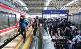 Penumpang KRL berjalan keluar di Stasiun Manggarai, Jakarta, Selasa (5/8/2025). Stasiun Manggarai sempat mengalami penumpukan penumpang akibat anjloknya rangkaian KRL Commuter Line di jalur 9 Stasiun Jakarta Kota. (FOTO : Republika/Prayogi)