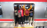Penumpang berada di dalam KRL di Stasiun Manggarai, Jakarta, Selasa (5/8/2025). Stasiun Manggarai sempat mengalami penumpukan penumpang akibat anjloknya rangkaian KRL Commuter Line di jalur 9 Stasiun Jakarta Kota. PT KAI Commuter Line melakukan rekayasa pola operasi perjalanan KRL Commuter Line. Untuk sementara, perjalanan KRL Commuter Line hanya sampai Stasiun Jayakarta dan Stasiun Gondangdia. (FOTO : Republika/Prayogi)