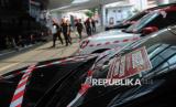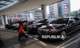 Petugas berjalan di depan deretan kendaraan mobil sitaan Kejaksaan Agung RI yang diparkir di depan Gedung Jampidsus, Kejaksaan Agung RI, Jakarta, Selasa (5/7/2025). Kejaksaan Agung RI menyita lima unit mobil mewah yang diduga milik tersangka kasus dugaan korupsi tata kelola minyak mentah Riza Chalid. Kelima mobil tersebut terdiri dari satu unit Toyota Alphard, Mini Cooper, dan tiga unit Mercedes-Benz. (FOTO : Republika/Thoudy Badai)
