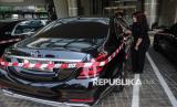 Petugas mengamati kendaraan mobil sitaan Kejaksaan Agung RI diparkir di depan Gedung Jampidsus, Kejaksaan Agung RI, Jakarta, Selasa (5/7/2025). Kejaksaan Agung RI menyita lima unit mobil mewah yang diduga milik tersangka kasus dugaan korupsi tata kelola minyak mentah Riza Chalid. Kelima mobil tersebut terdiri dari satu unit Toyota Alphard, Mini Cooper, dan tiga unit Mercedes-Benz. (FOTO : Republika/Thoudy Badai)