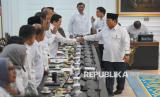 Presiden Prabowo Subianto (kanan) didampingi Wapres Gibran Rakabuming Raka (kedua kanan) menjabat tangan Menteri BUMN Erick Thohir (keempat kanan) dan para menteri kabinet Merah Putih lainnya sebelum Sidang Kabinet Paripurna di Kantor Presiden, Istana Kepresidenan, Jakarta, Rabu (6/8/2025). Sidang kabinet paripurna tersebut membahas perkembangan program kerja pemerintahan Presiden Prabowo Subianto dan Wapres Gibran Rakabuming Raka, di antaranya di bidang pangan, energi, pemberantasan kemiskinan, hingga pembangunan SDM. (FOTO : ANTARA FOTO/Aditya Pradana Putra)