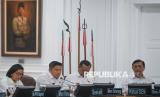 Sekretaris Kabinet Teddy Indra Wijaya (kedua kiri) bersama Menteri Keuangan Sri Mulyani Indrawati (kiri), Mensesneg Prasetyo Hadi (kedua kanan), dan Ketua Dewan Ekonomi Nasional (DEN) Luhut Binsar Pandjaitan (kanan) menyampaikan paparan dalam Sidang Kabinet Paripurna di Kantor Presiden, Istana Kepresidenan, Jakarta, Rabu (6/8/2025). Sidang kabinet paripurna tersebut membahas perkembangan program kerja pemerintahan Presiden Prabowo Subianto dan Wapres Gibran Rakabuming Raka, di antaranya di bidang pangan, energi, pemberantasan kemiskinan, hingga pembangunan SDM. (FOTO : ANTARA FOTO/Aditya Pradana Putra)