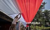 REPUBLIKA.CO.ID, PADALARANG -- Warga memasang dekorasi kain merah putih di Kampung Rancabali, Padalarang, Kabupaten Bandung Barat, Jawa Barat, Kamis (7/8/2025).