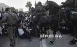 Polisi berkuda membubarkan warga Yahudi ultra-Ortodoks yang memblokir jalan saat aksi demonstrasi menentang kebijakan wajib militer di Yerusalem, Kamis (7/8/2025). Aksi menolak kebijakan wajib militer di Israel berakhir ricuh. Komunitas Yahudi Ortodoks menolak langkah pemerintah yang mewajibkan mahasiswa seminari untuk menjalani wajib militer. (FOTO : AP Photo/Mahmoud Illean)