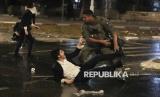 Seorang warga Yahudi ultra-Ortodoks terjatuh saat aparat membubarkan aksi blokir jalan menentang kebijakan wajib militer di Yerusalem, Kamis (7/8/2025). Aksi menolak kebijakan wajib militer di Israel berakhir ricuh. Komunitas Yahudi Ortodoks menolak langkah pemerintah yang mewajibkan mahasiswa seminari untuk menjalani wajib militer. (FOTO : AP Photo/Mahmoud Illean)