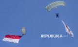 Prajurit TNI melakukan terjun payung dengan membawa bendera Merah Putih usai Upacara Gelar Pasukan Operasional dan Kehormatan Militer di Lapangan Udara (Lanud) Suparlan Pusdiklatpassus, Batujajar, Kabupaten Bandung Barat, Jawa Barat, Ahad (10/8/2025). Atraksi militer dan demonstrasi terpadu tersebut merupakan salah satu bentuk komitmen untuk memperkuat pertahanan negara dengan mengutamakan kemandirian, keunggulan operasional, dan teknologi pertahanan serta kesiapsiagaan. (FOTO : ANTARA FOTO/Abdan Syakura)