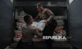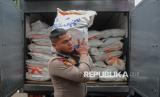 Petugas menyiapkan beras untuk program Gerakan Pangan Murah di lapangan Polda Metro Jaya, Jakarta, Selasa (12/8/2025). Dalam rangka menyambut Hari Kemerdekaan ke-80 Republik Indonesia, Polda Metro Jaya menggelar Gerakan Pangan Murah dengan menawarkan beras berkualitas dengan harga dibawah pasaran yakni Rp11.000 per kilogram yang berlangsung hingga 16 Agustus mendatang. (FOTO : Republika/Thoudy Badai)