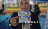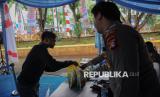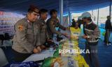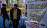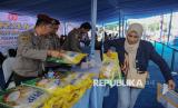 Warga menukarkan kupon dengan beras 5 kilogram di lapangan Polda Metro Jaya, Jakarta, Selasa (12/8/2025). Dalam rangka menyambut Hari Kemerdekaan ke-80 Republik Indonesia, Polda Metro Jaya menggelar Gerakan Pangan Murah dengan menawarkan beras berkualitas dengan harga dibawah pasaran yakni Rp11.000 per kilogram yang berlangsung hingga 16 Agustus mendatang. (FOTO : Republika/Thoudy Badai)
