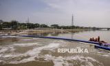Pemerintah Provinsi DKI Jakarta menyiapkan sejumlah cara termasuk memasang jaring terapung untuk menanggulangi busa di Pintu Air Wier 3, Banjir Kanal Timur (BKT), Jakarta Utara. Jaring terapung berfungsi untuk melokalisasi penyebaran busa. (FOTO : ANTARA FOTO/Dhemas Reviyanto)