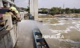 REPUBLIKA.CO.ID, JAKARTA -- Petugas mengambil sampel air saat simulasi penanganan busa di Pintu Air Weir 3 Marunda, Kanal Banjir Timur (KBT), Jakarta, Rabu (13/8/2025).