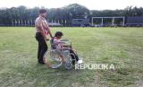 Pramuka berkebutuhan khusus mendorong kursi roda rekannya disela gladi bersih Upacara Peringatan Hari Pramuka ke-64 Tahun 2025 dan Pembukaan Perkemahan Pramuka Berkebutuhan Khusus (PPBK) Tingkat Nasional Tahun 2025 di Lapangan Utama Bumi Perkemahan, Cibubur, Jakarta, Rabu (13/8/2025). (FOTO : Republika/Prayogi)