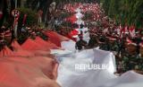 REPUBLIKA.CO.ID, BOGOR -- Sejumlah personel TNI dan Polri membentangkan Bendera Merah Putih dalam Kirab Merah Putih di Lingkar Stadion Pakansari, Kabupaten Bogor, Jawa Barat, Kamis (14/8/2025).