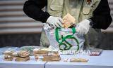 Petugas KPK menunjukkan barang bukti uang tunai saat konferensi pers penahanan tersangka kasus dugaan suap izin pemanfaatan kawasan hutan di Gedung Merah Putih KPK, Jakarta, Kamis (14/8/2025). KPK menahan tiga tersangka pasca OTT yakni Direktur Utama PT Inhutani V Dicky Yuanda Rady, staf perizinan PT Sungai Budi Grup Aditya, dan Direktur Utama PT Paramita Mulia Langgeng Djunaidi terkait kasus dugaan suap izin pemanfaatan kawasan hutan di PT Eksploitasi dan Industri Hutan (Inhutani) V serta menyita barang bukti uang tunai senilai SGD189.000 (Rp2,4 miliar), Rp8,5 juta, dan dua unit mobil. (FOTO : ANTARA FOTO/Sulthony Hasanuddin)