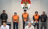 Plt Deputi Penindakan dan Eksekusi KPK Asep Guntur Rahayu (bawah kiri) bersama Juru Bicara KPK Budi Prasetyo (bawah kanan) menghadirkan tersangka kasus dugaan suap izin pemanfaatan kawasan hutan Direktur Utama PT Inhutani V Dicky Yuanda Rady (atas kedua kanan), staf perizinan PT Sungai Budi Grup Aditya (atas tengah), dan Direktur Utama PT Paramita Mulia Langgeng Djunaidi (atas kedua kiri) di Gedung Merah Putih KPK, Jakarta, Kamis (14/8/2025). KPK menahan tiga tersangka pasca OTT yakni Direktur Utama PT Inhutani V Dicky Yuanda Rady, staf perizinan PT Sungai Budi Grup Aditya, dan Direktur Utama PT Paramita Mulia Langgeng Djunaidi terkait kasus dugaan suap izin pemanfaatan kawasan hutan di PT Eksploitasi dan Industri Hutan (Inhutani) V serta menyita barang bukti uang tunai senilai SGD189.000 (Rp2,4 miliar), Rp8,5 juta, dan dua unit mobil. (FOTO : ANTARA FOTO/Sulthony Hasanuddin)