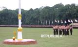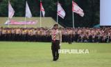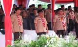 Pemimpin upacara mengikuti Upacara Peringatan Hari Pramuka ke-64 Tahun 2025 dan Pembukaan Perkemahan Pramuka Berkebutuhan Khusus (PPBK) Tingkat Nasional Tahun 2025 di Lapangan Utama Bumi Perkemahan, Cibubur, Jakarta, Kamis (14/8/2025). Upacara Peringatan Hari Pramuka ke-64 Tahun 2025, yang dirangkaikan dengan Pembukaan Perkemahan Pramuka Berkebutuhan Khusus (PPBK) Tingkat Nasional Tahun 2025 tersebut mengusung tema Kolaborasi untuk Membangun Ketahanan Bangsa. (FOTO : Republika/Prayogi)