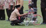 Menteri Koordinator Bidang Pembangunan Manusia dan Kebudayaan (Menko PMK) Pratikno berbincang dengan salah satu Pramuka berkebutuhan khusus penerimaan penghargaan dalam upacara Peringatan Hari Pramuka ke-64 Tahun 2025 dan Pembukaan Perkemahan Pramuka Berkebutuhan Khusus (PPBK) Tingkat Nasional Tahun 2025 di Lapangan Utama Bumi Perkemahan, Cibubur, Jakarta, Kamis (14/8/2025). Upacara Peringatan Hari Pramuka ke-64 Tahun 2025, yang dirangkaikan dengan Pembukaan Perkemahan Pramuka Berkebutuhan Khusus (PPBK) Tingkat Nasional Tahun 2025 tersebut mengusung tema Kolaborasi untuk Membangun Ketahanan Bangsa. (FOTO : Republika/Prayogi)