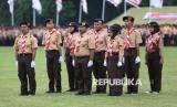 Anggota Pramuka bersiap mengikuti Upacara Peringatan Hari Pramuka ke-64 Tahun 2025 dan Pembukaan Perkemahan Pramuka Berkebutuhan Khusus (PPBK) Tingkat Nasional Tahun 2025 di Lapangan Utama Bumi Perkemahan, Cibubur, Jakarta, Kamis (14/8/2025). Upacara Peringatan Hari Pramuka ke-64 Tahun 2025, yang dirangkaikan dengan Pembukaan Perkemahan Pramuka Berkebutuhan Khusus (PPBK) Tingkat Nasional Tahun 2025 tersebut mengusung tema Kolaborasi untuk Membangun Ketahanan Bangsa. (FOTO : Republika/Prayogi)