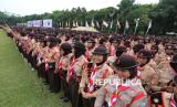 REPUBLIKA.CO.ID, JAKARTA -- Anggota Pramuka mengikuti Upacara Peringatan Hari Pramuka ke-64 Tahun 2025 dan Pembukaan Perkemahan Pramuka Berkebutuhan Khusus (PPBK) Tingkat Nasional Tahun 2025 di Lapangan Utama Bumi Perkemahan, Cibubur, Jakarta, Kamis (14/8/2025).