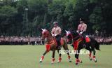 Anggota Pramuka dengan mengunakan kuda saat Upacara Peringatan Hari Pramuka ke-64 Tahun 2025 dan Pembukaan Perkemahan Pramuka Berkebutuhan Khusus (PPBK) Tingkat Nasional Tahun 2025 di Lapangan Utama Bumi Perkemahan, Cibubur, Jakarta, Kamis (14/8/2025). Upacara Peringatan Hari Pramuka ke-64 Tahun 2025, yang dirangkaikan dengan Pembukaan Perkemahan Pramuka Berkebutuhan Khusus (PPBK) Tingkat Nasional Tahun 2025 tersebut mengusung tema Kolaborasi untuk Membangun Ketahanan Bangsa. (FOTO : Republika/Prayogi)