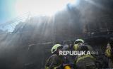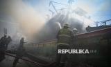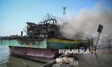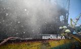 REPUBLIKA.CO.ID, JAKARTA -- Petugas pemadam kebakaran melakukan pendinginan kapal nelayan yang terbakar di Dermaga Barat Pelabuhan Muara Baru, Jakarta, Sabtu (16/8/2025).